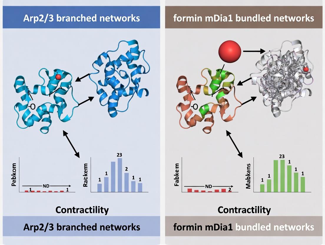 This article provides a comprehensive analysis of the distinct roles played by Arp2/3 complex-generated branched actin networks and formin mDia1-mediated bundled filaments in cellular contractility.