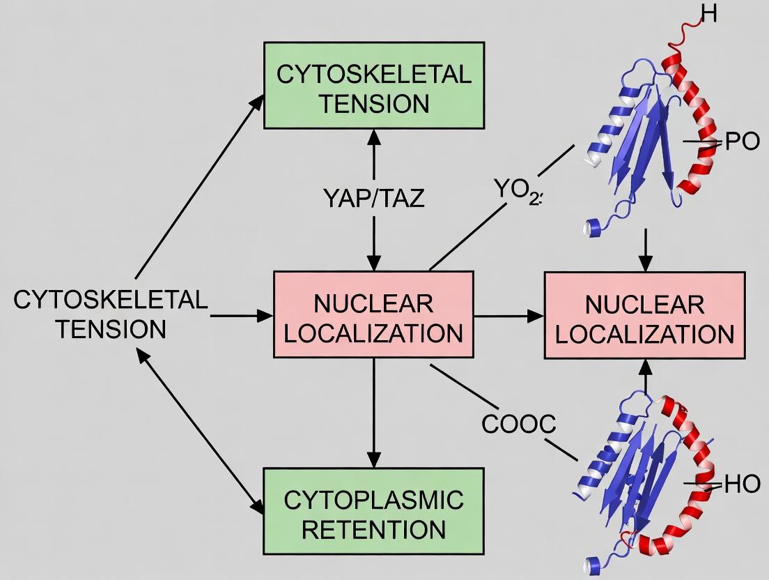 Conclusion YAP and TAZ stand at a critical nexus, decoding cellular geometry and tension into transcriptional programs. Their regulation extends far beyond the canonical Hippo pathway, with cytoskeletal forces playing a defining role. This integration of biomechanical and biochemical signals presents both a challenge and an opportunity for therapeutic intervention, necessitating continued in-depth research into the precise mechanisms detailed in this guide.