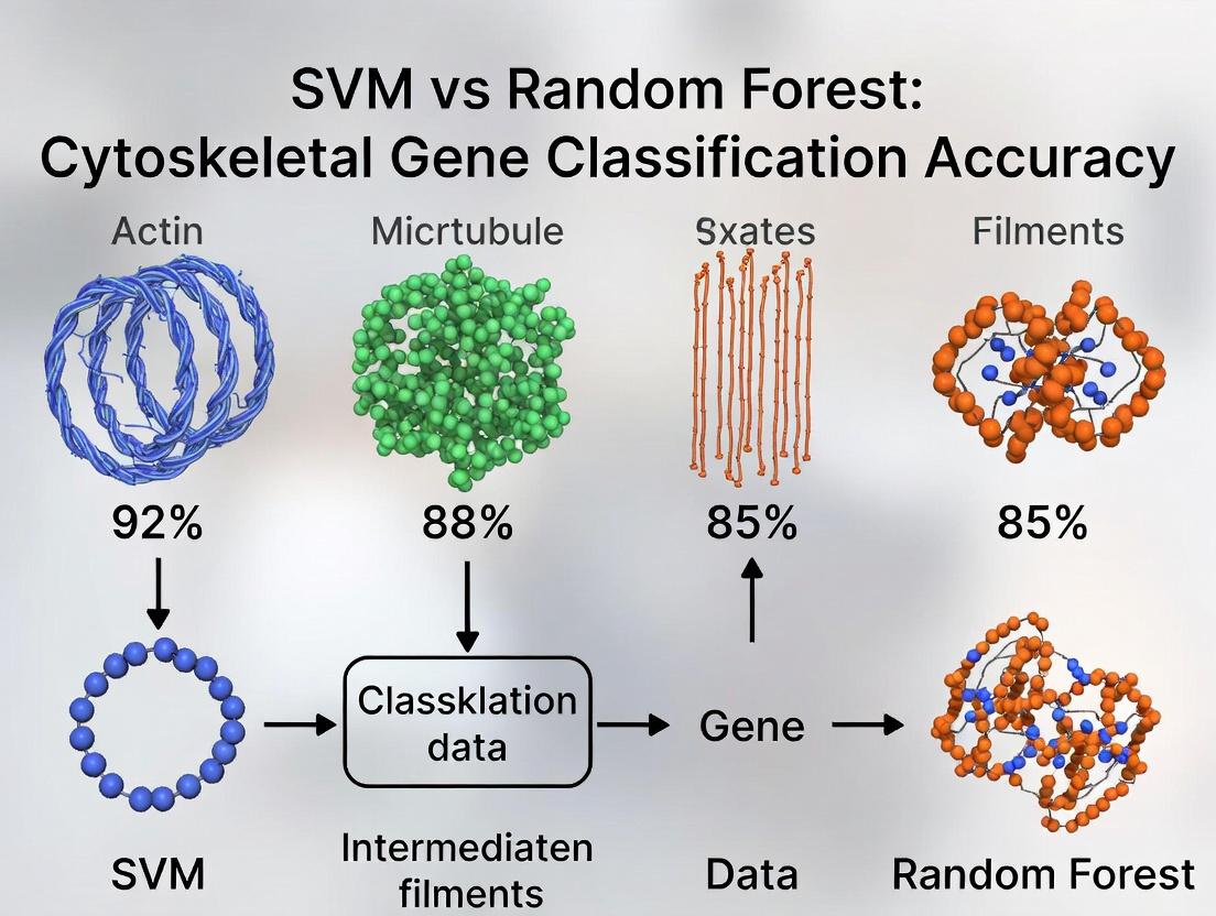 The accurate classification of genes encoding cytoskeletal proteins is a critical bioinformatics task with profound implications for understanding cell mechanics, division, motility, and signaling. Misclassification can lead to erroneous biological conclusions and hamper the identification of disease-associated genetic variants. This guide compares the performance of two prominent machine learning algorithms—Support Vector Machines (SVM) and Random Forest (RF)—in classifying cytoskeletal genes, providing a data-driven resource for researchers selecting computational tools.